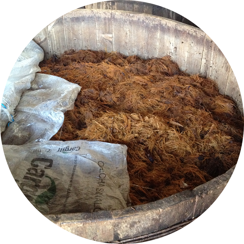 加熱されたピニャは、多くが「タオナ」という回転式の石臼で搾汁され、繊維(バガス)と一緒に木製の発酵槽で自然発酵される。