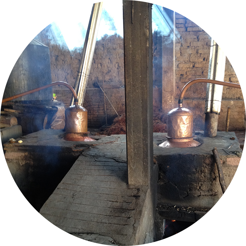 多くのメスカルが、容量20リットルほどの小型で原始的な薪による直火式の単式蒸留器で少なくとも2回蒸留される。